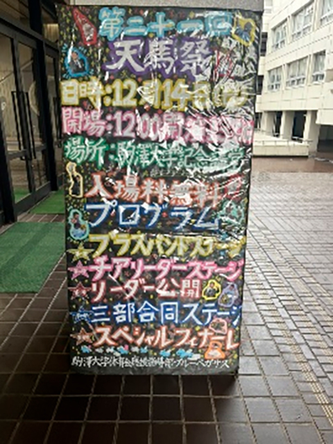 リーダー部、チアリーダー部、ブラスバンド部の三つの部で構成されるブルぺは、『頑張る駒大生を応援する』学内唯一の応援団体です。この天馬祭は、ブルぺが代替わりとなる毎年12月に各種体育会部活動の応援活動等の実演の経験に加えて、これまでの練習の成果を大学内へ演技披露を行う発表会で、現役の体育会所属の学生やOB、OGが観覧できる盛大なお祭りです。