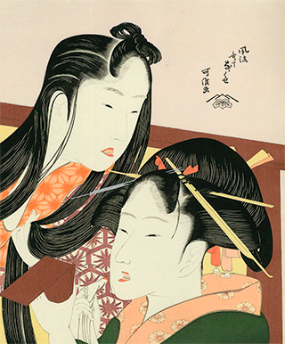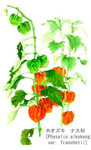 「七夕」の餝り室礼(しつらい)で準備した翌日には、若者は市街に浴衣着でくり出し、「酸漿市(ほおずきいち)」(愛宕神社、浅草寺)にて各々見合った竹籠状の庭上空間植物をもち帰る。なかでも「ほおずき」は橙色から赤色と「あかかがち」として親しまれてきた。観賞用もあれば食用もある。江戸の絵師、葛飾北斎が描いた若き女人が口に咥える図絵はその風情をものの美事にくっきりと伝えている。よく指で揉み解した酸漿の実をするっと呑み込んで、残った皮で袋状の笛づくりをする。巧く作り得た最初の子が鳴らす「ぶぅーぶぅー」という音色が懐かしい。「鬼燈笛」とは良くも言ったものだ。