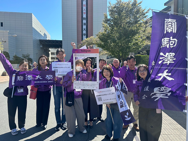令和8年4月8日、駒澤大学の入学式にあわせて、駒澤大学教育後援会では記念写真撮影のお手伝いを行いました。正門から少し進んだ図書館前で、『祝入学 駒澤大学』の幕を背景にしていただき、小さな両手旗をお持ちいただきながら、新入生とご家族、ご友人の写真撮影をサポートしました。また、インスタグラムなどのSNS向け撮影用パネルも用意し、多くの学生の皆さんに楽しくご利用いただきました。