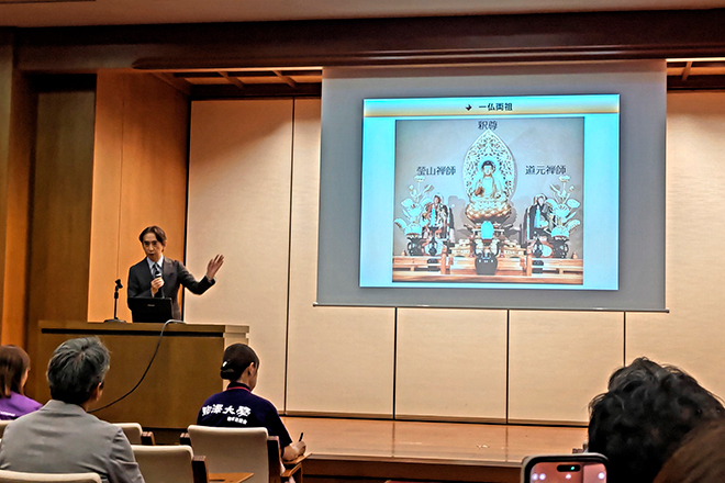 駒澤大学が学生に教えている仏教教育はどの様なことなのかを保護者も勉強する機会として講演会を初めて企画しました。「釈尊」の教えと「禅」の精神をテーマとした講義を吉村副学⾧に御依頼しました。仏教の目的は苦を除き、やすらぎを与える事であり、物事が原因と条件によって生起することを知的に理解することをお釈迦様が悟ったと、詳しくお話しいただき ました。智慧や慈悲など理解は難しいですが、不平不満の人生ではなく穏やかな人生を送ることができるのであれば素晴らしいことだと思います。中央講堂での講演は十六羅漢に囲まれた雰囲気のある会場で厳粛な気持ちになりました。参加者からは続きを聞きたいとの反響でした。